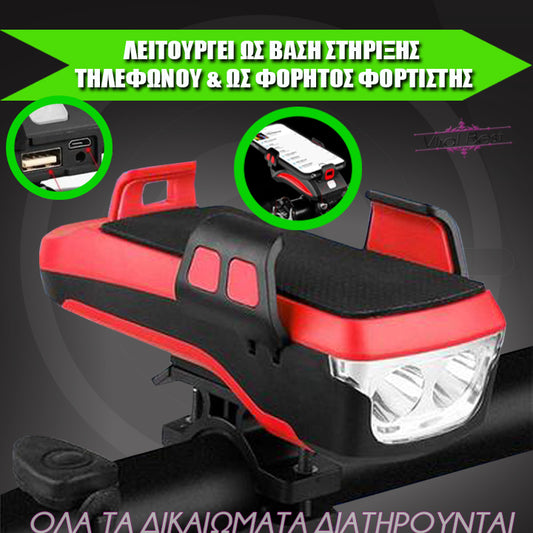 4 Σε 1 Πολυεξάρτημα Ποδηλάτου (Βάση Στήριξης, Φορητός Φορτιστής, Φακός, Κόρνα)